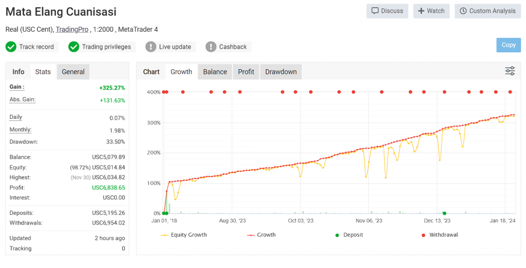 Mata Elang adalah EA tangguh yang mampu mengembangkan akun pribadi secara stabil setiap bulannya dan menjadikan trading lebih mudah bagi mereka yang tidak punya waktu atau energi untuk belajar trading dan menghabiskan waktu berjam-jam di depan Monitor